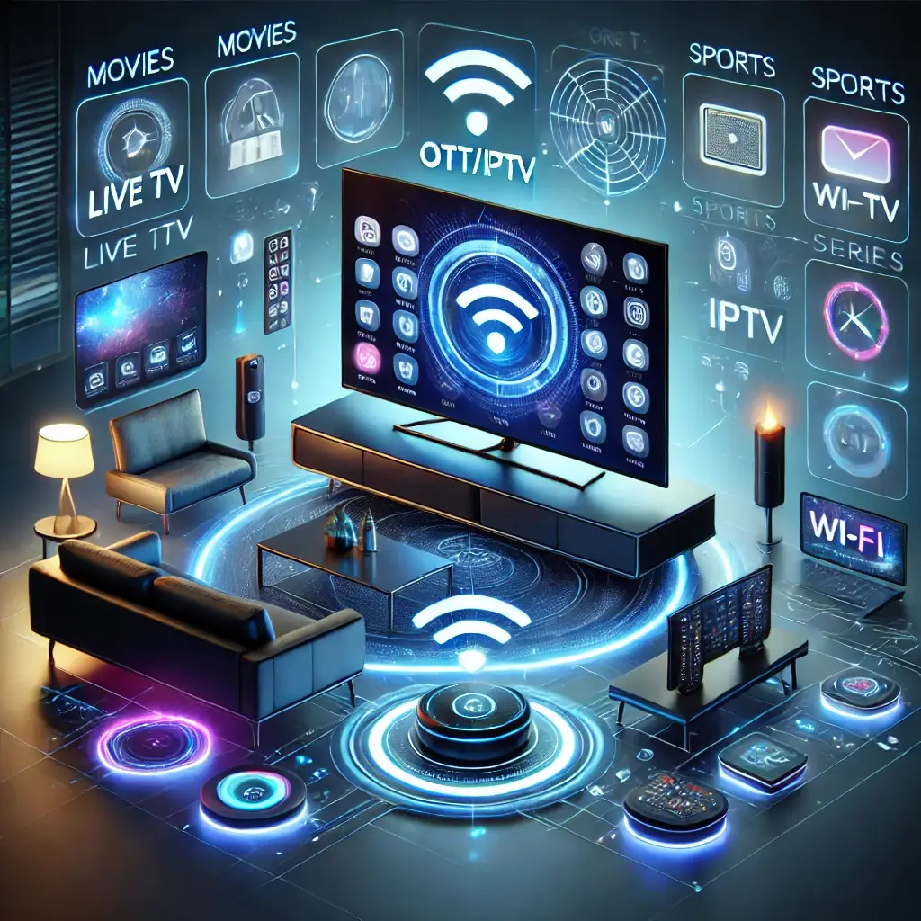 Comprehensive OTT/IPTV platform featuring a launcher, middleware, TV and mobile applications, CRM, and DRM encryption modules. The system enables transcoding, packaging, and secure encryption of live and recorded content for seamless distribution over the internet (OTT) and intranet (IPTV).